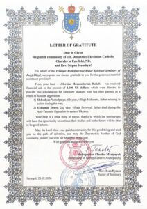 The first scholarship recipient is Volodymyr Slobodyan, currently in his sixth year of study, and the second is Denys Yatsunda, who is in his second year of seminary formation. The parish also received a Letter of Gratitude from Teodor Martynyuk, Archbishop of Ternopil, as well as from the seminary rector, Ivan Rymar, expressing appreciation for the support offered by the faithful of the parish.